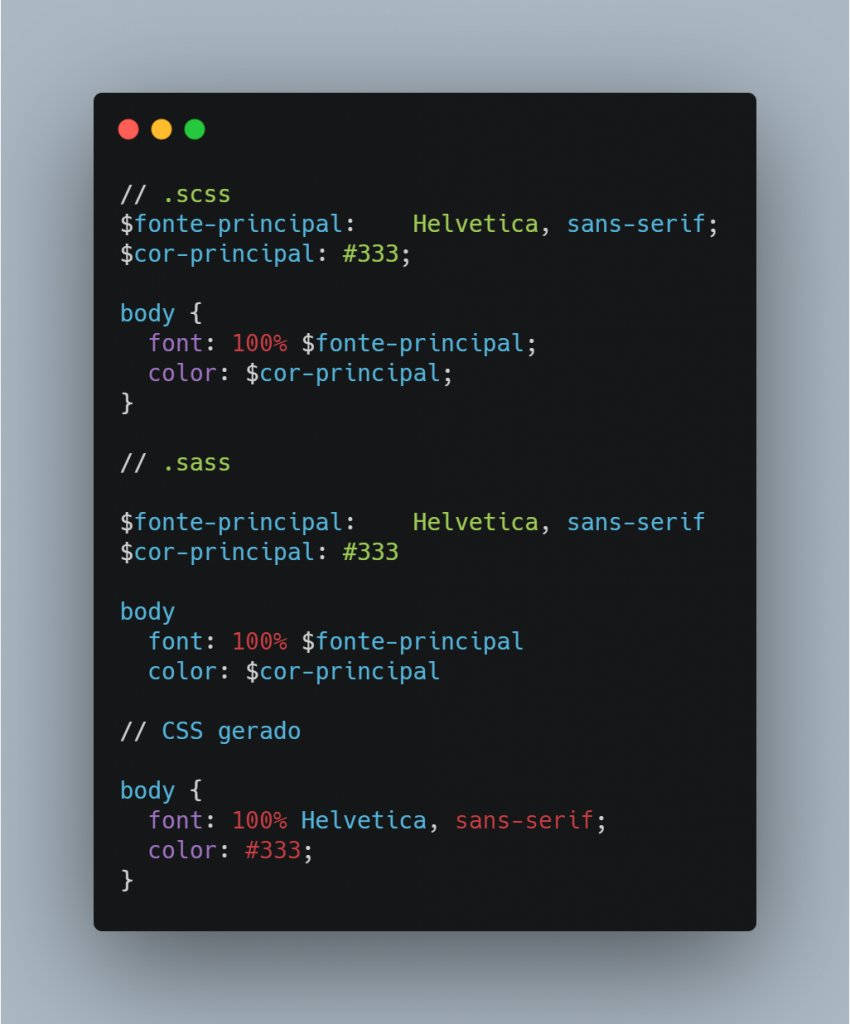 - SCSS (Sassy CSS): usa a extensão .scss e é completamente compatível com CSS comum.