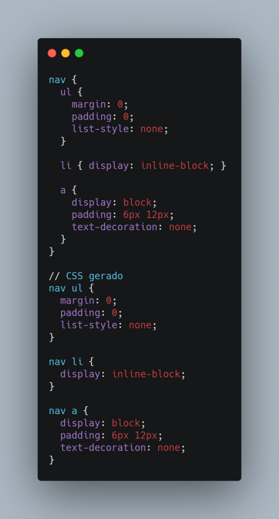 O Aninhamento de estilo permite ver de maneira mais simples o estilo aplicado ao HTML, pois pode-se estruturar o estilo da mesma forma do HTML.